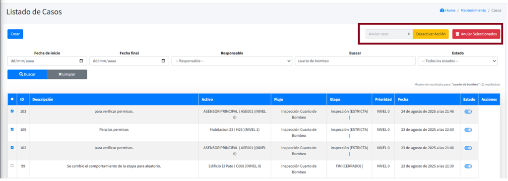 También se pueden seleccionar todos los casos visibles al seleccionar el checkbox de la línea del encabezado del listado, y seguidamente se hace clic en el botón Anular Seleccionados.