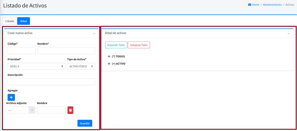 Para crear una activo se utiliza la sección izquierda del formulario Árbol de activos, debe ubicar el cursor en la etiqueta Código y escribir el código que desea asignar al nuevo activo; este es un valor alfanumérico, luego escribir el nombre del activo, seleccionar una prioridad y un tipo y registrar una descripción que no supere los 255 caracteres. Para guardar de clic en el botón Agregar.