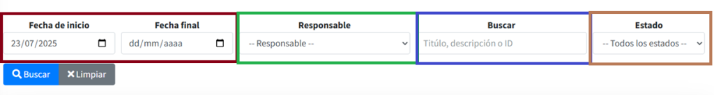 Para aplicar los filtros de Fecha de inicio, Fecha final y Título, descripción o ID, se da clic en el botón Buscar, pero los filtro de Responsable y Estado se aplican con la selección de un elemento de la lista. Para eliminar cualquiera de los filtros aplicados se clic en el botón Limpiar.