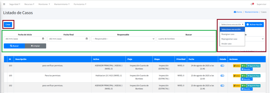 Opción que permite la programación de las actividades de mantenimiento y dar inicio a un flujo de trabajo previamente configurado, vinculándolo directamente con un activo seleccionado. Este proceso es esencial para garantizar una gestión eficiente, ya que no solo establece el punto de partida del flujo, sino que también facilita su control y seguimiento. Durante la ejecución, se registran elementos clave como las horas de operación, los responsables asignados a cada etapa y las evidencias generadas en cada paso del proceso. Desde esta opción se gestión de manera general todos los casos, utilizando sus principales opciones:
