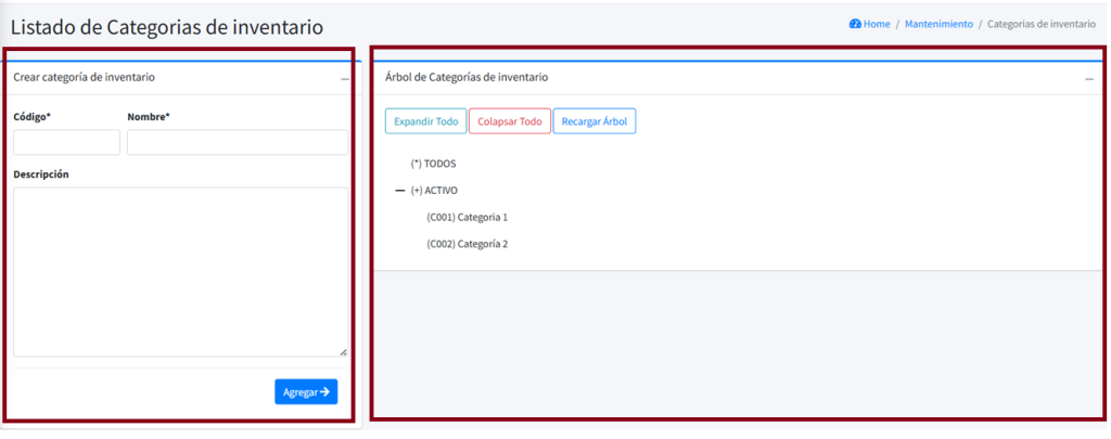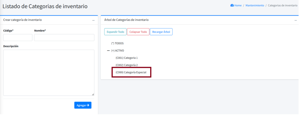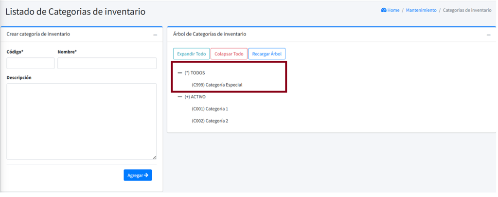 Cada nueva categoría es asociado a la rama del árbol (*) TODOS, para visualizar el todo el contenido del árbol, colapsar sus ramas o recargar el contenido, utilice los botones Expandir Todo, Colapsar Todo o Recargar Árbol de acuerdo con la necesidad.
