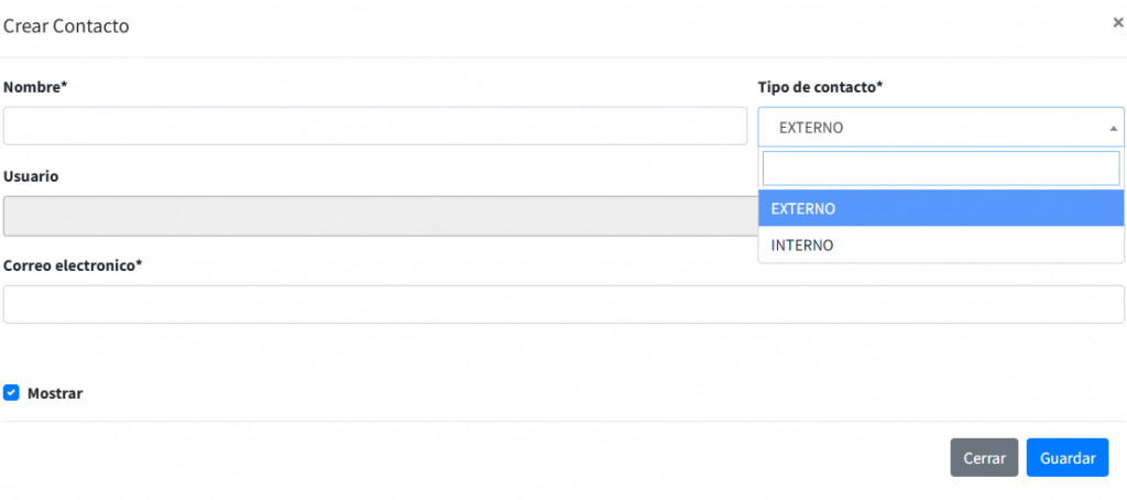 Si es externo, unicamente llenar el campo de correo electrónico, en cambio, al ser interno, en el bloque de usuario encontraras un listado de los contactos internos del sistema, el cual, al seleccionar este, se auto completará el bloque de correo electrónico.