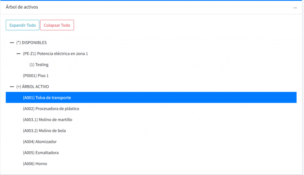 Para ubicar el activo creado en el árbol de activos, inicialmente extender la opción de árbol de activos dando clic en el símbolo (+), hacer clic presionado en el activo deseado y arrastrar dentro del árbol.