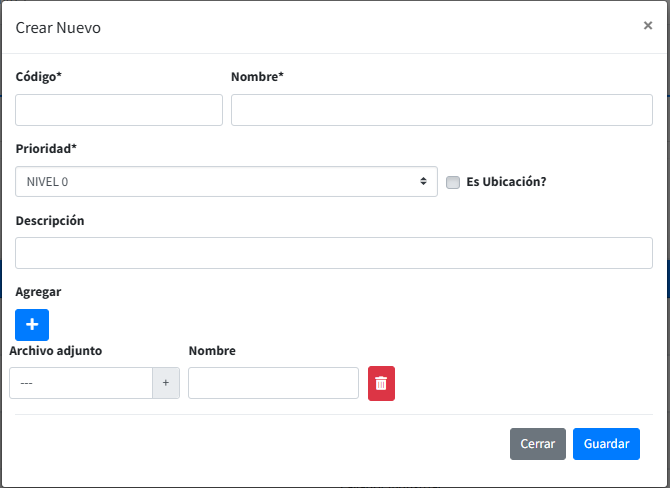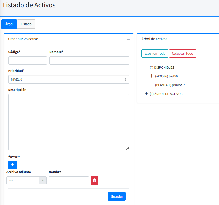 Creación de listado de activos: Opción que permite registrar el activo existente en campo. Este activo se identifica con un código y nombre único que es establecido por el usuario, la prioridad se tomara de acuerdo al grado de criticidad que quiera asignarle; Por ejemplo: si el nivel cero ¨0¨ será muy importante, nivel cuatro ¨4¨ será menos importante. Continuando el registro nos encontramos con un cuadro de descripción de información adicional de ser necesario; siguiendo de la misma forma nos encontramos con Agregar donde nos permite como su nombre lo dice agregar documentos, PDF, DOC hasta 3MB .Del mismo modo estos activos se pueden identificar como padre/hijo teniendo un padre que es el elemento de mayor impacto y varios activos hijos que son sub-elementos del padre.
