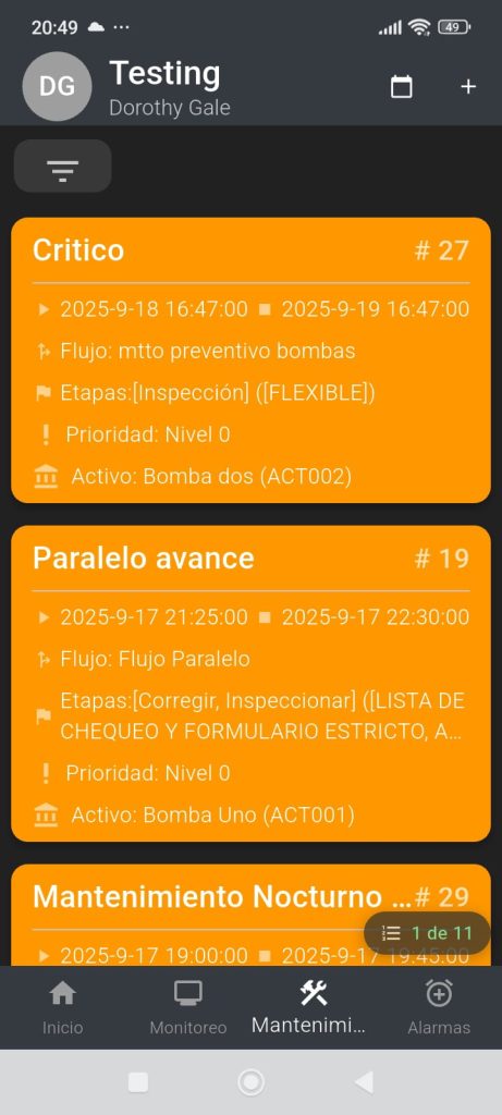 Desde la sección Mantenimiento de la aplicación se gestionan los casos (tareas de mantenimiento preventivo y/o correctivo), asignadas a cada técnico.
