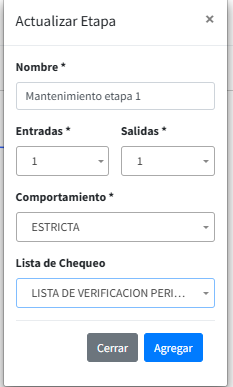 Nueva etapa : Crea una nueva etapa donde se puede relacionar con una lista de chequeo, para su documentación y registro del desarrollo de la operación.