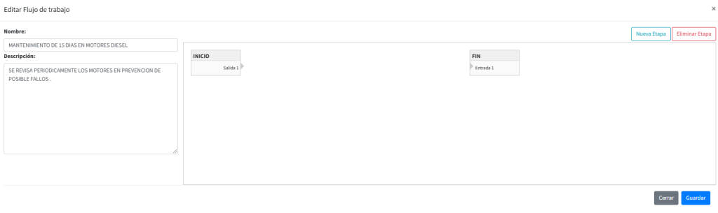 Crear un flujo un proceso inicialmente se rellena el dato de Nombre como se va llamar al flujo de trabajo, en la descripción se colocara los detalle a tener en en cuenta en cada etapa del flujo en general; por otro lado encontraremos múltiples forma de crear un flujo de trabajo según lo establezca una rutina para sus activos o solo para un activo en especial; las Etapas creadas por defecto seria inicio y fin: