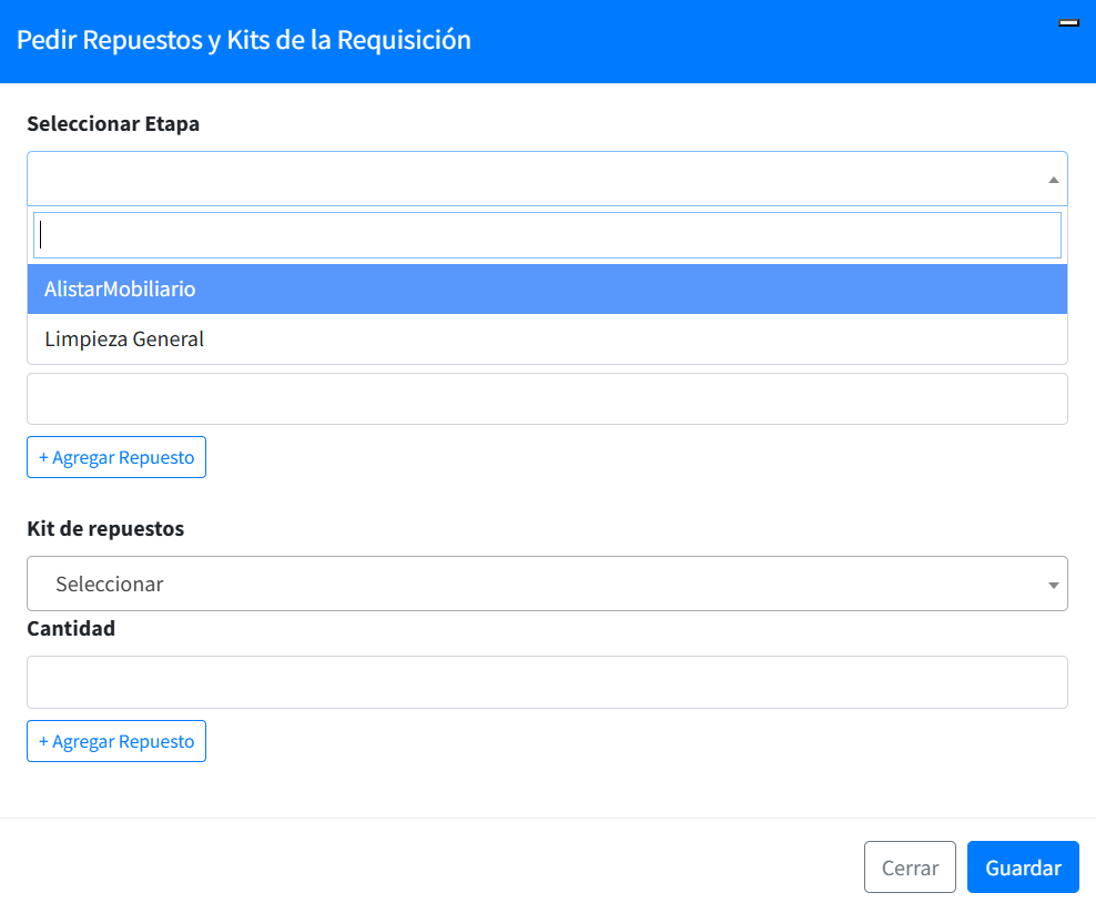 La lista desplegable Seleccionar Etapa permite indicar la etapa en la cual serán utilizados los repuestos de la requisición, luego deben ser adicionados todos los repuestos o kit e indicar las cantidades a utilizar; cada ítem se agrega con el botón Agregar Repuesto, para finalizar el registro utilice el botón Guardar de la esquina inferior derecha.