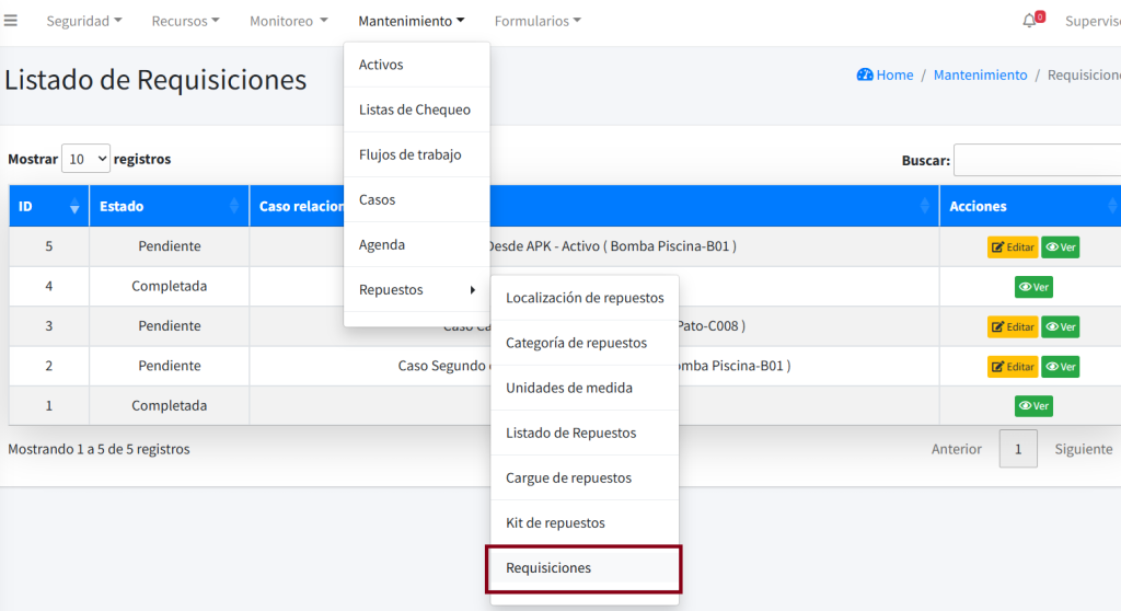 Todas las requisiciones creadas se pueden consultar desde la opción Requisiciones del sub menú Repuestos.