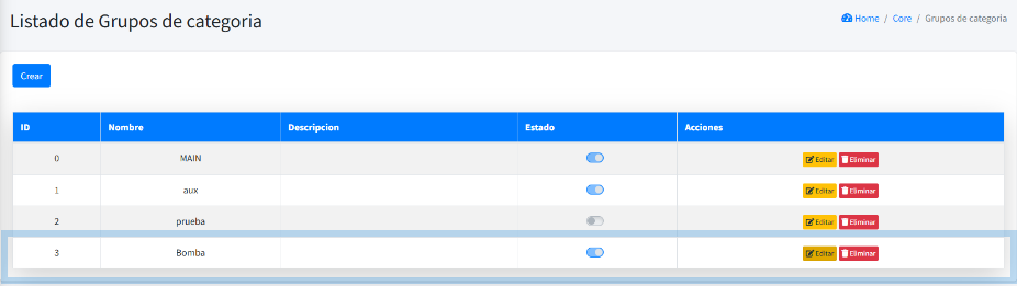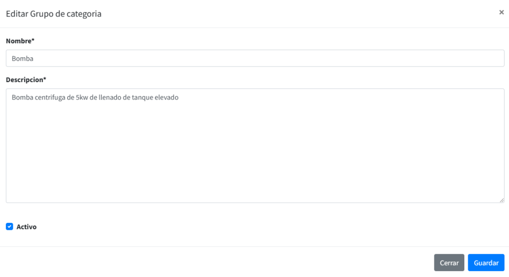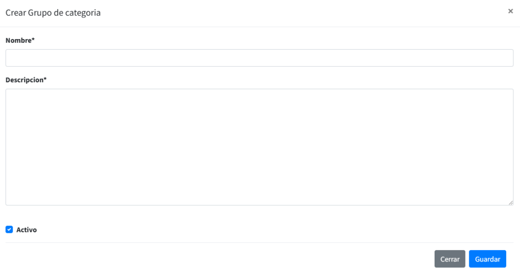 Definir un nombre y establecer una descripción que defina a que corresponde esa categoría. Verificar que botón de activo esté marcado pues este grupo se vincula con la opción categoría en caso contrario no se visualizará en esta opción.
