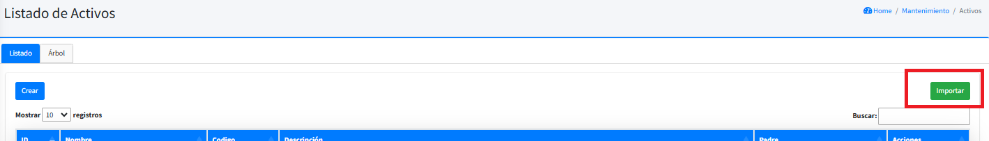 Paso 1: Acceder al apartado de activos, dar clic en el botón importar.