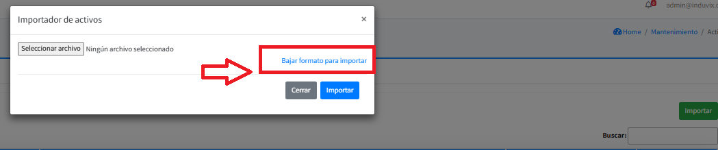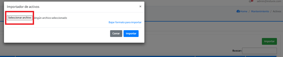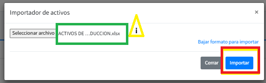 Paso 3: Cargar archivo con los activos. Asegúrate de que todos los datos de tus activos estén completos en el archivo Excel que creaste y guardaste previamente. Abre la plataforma en activos, haz clic en el botón de “Importar” . Esto abrirá una ventana emergente, que es la misma que viste al descargar el formato. Dentro de la ventana emergente, haz clic en “Seleccionar archivo”. Esto te permitirá navegar hasta la carpeta donde guardaste el archivo Excel con los datos de tus activos. Si aún no has seleccionado un archivo, aparecerá el mensaje: “Ningún archivo seleccionado” al lado del botón de selección.
