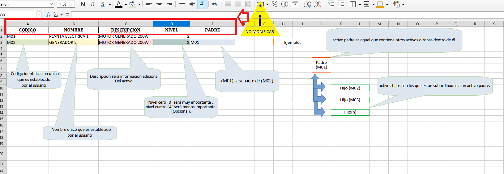 Nota: Solo podrás modificar los datos a rellenar después de cada encabezado de las columna. No modificar en cabezadas de los archivos.