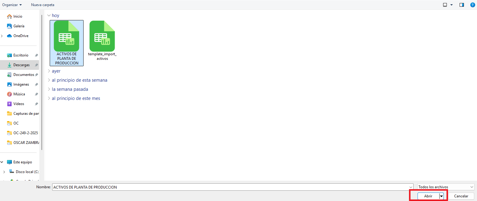 Una vez descargado, ve a la carpeta de descargas de tu ordenador. Ahí encontrarás el archivo con el nombre template_import_activos.