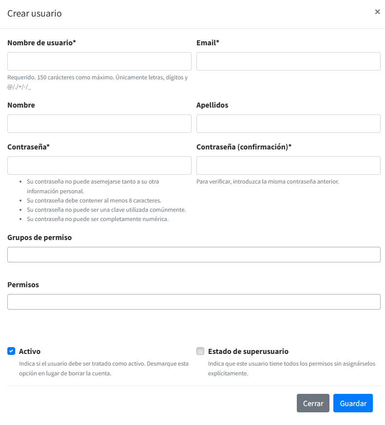 El indicador de activo se selecciona automáticamente, este significa que el usuario está verificado para utilizar la aplicación web con los permisos establecidos, en caso de quitar esa opción aunque el usuario esté creado no es posible acceder a la aplicación web hasta que esté nuevamente activo. Y la opción de Estado de súper usuario permite crear un usuario el cual va a contar con el control total de la aplicación sin necesidad de asignarle todos los permisos.
