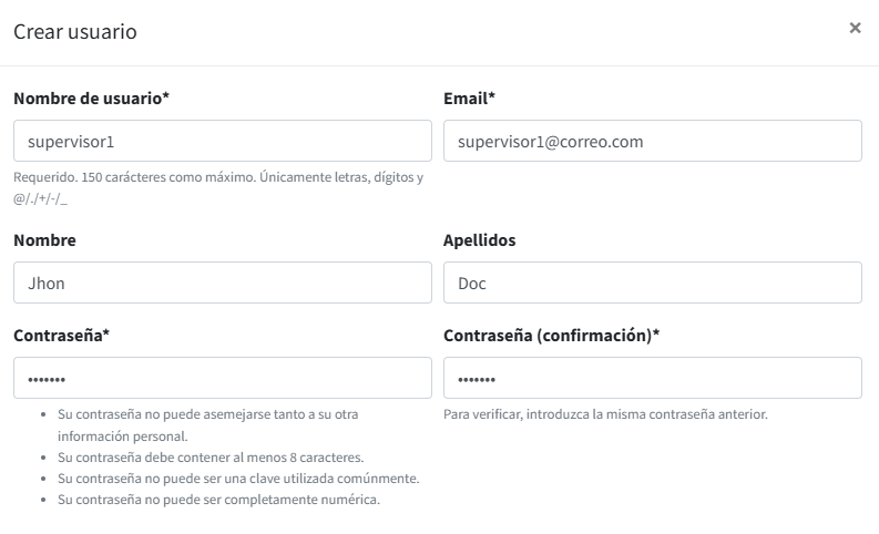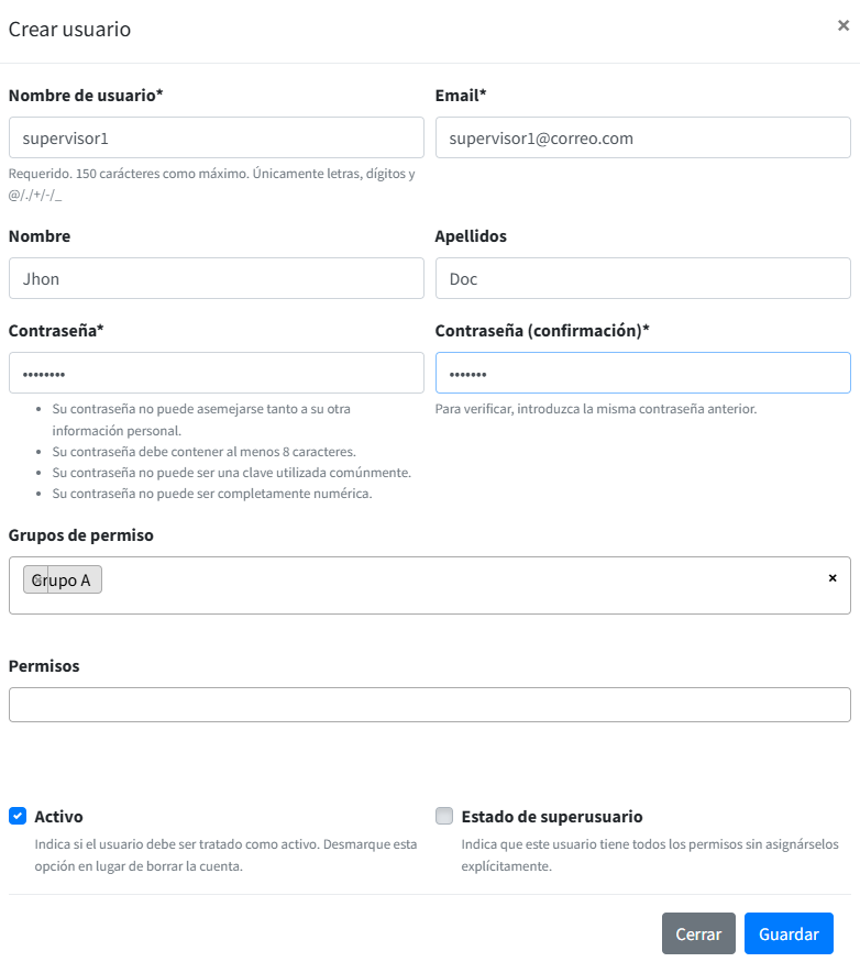 Para la asignación de grupos y/o permisos que tiene cada usuario se deben asignar en los recuadros de permisos y/o Grupo de permisos respectivamente. Dicho grupo de permisos son aquellos asignados anteriormente. Es decir se va a asignar el Grupo A al supervisor encargado adicional a eso si es necesario asignarle un permiso único sin necesidad de crear o modificar el grupo se le puede asignar directamente en el apartado de Grupos de Permisos.