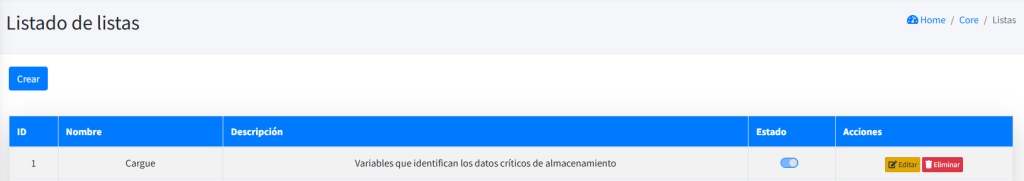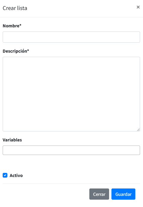 Se establece el nombre de la lista para su identificación, se realiza una descripción que ayude a identificar que contenido hay en cuya lista, y se establecen las variables de interés, estas variables son las que son recogidas de campo y registradas en el apartado de Variables.