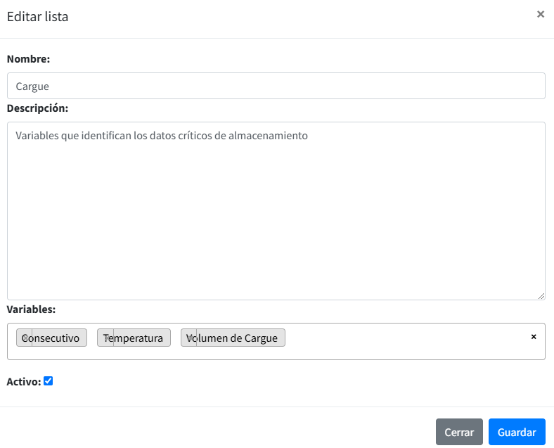 El campo Listas organiza y agrupa las variables necesarias para la supervisión de operaciones específicas. Cada lista corresponde a un conjunto definido de variables y está asociada a las categorías creadas en el sistema, lo que asegura una estructura coherente para la visualización y el análisis. Esta funcionalidad permite a los usuarios adaptar la supervisión a los procesos críticos de su empresa, manteniendo un control eficiente y preciso sobre los parámetros clave.