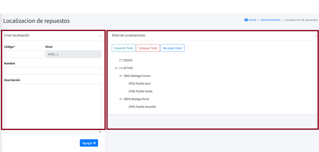 Opción que permite gestionar las localizaciones en las que se ubican los repuestos, permite simular el árbol de ubicación física dentro de diferentes zonas, bodegas y/o almacenes.