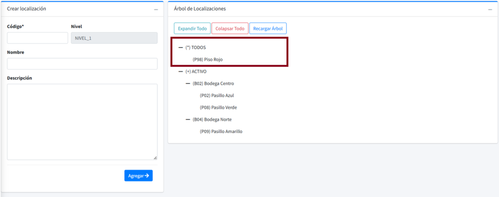 Cada nueva localización es asociado a la rama del árbol (*) TODOS, para visualizar el todo el contenido del árbol, colapsar sus ramas o recargar el contenido, utilice los botones Expandir Todo, Colapsar Todo o Recargar Árbol de acuerdo con la necesidad.