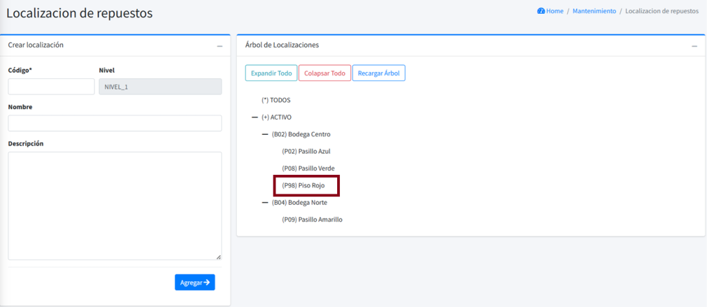 Para crear una localización se utiliza la sección izquierda del formulario Localización de repuestos, debe ubicar el cursor en la etiqueta Código y escribir el código que desea asignar a la nueva localización; este es un valor alfanumérico, luego escribir el nombre de la localización y una descripción que no supere los 255 caracteres. Durante la creación de cada localización no es posible definir el nivel, estas son creadas por defecto con NIVEL_1. Para guardar de clic en el botón Agregar.
