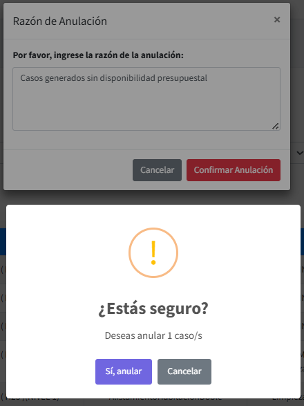 Para confirmar la anulación es requerido que se registre la razón de la anulación y se de clic en el botón Confirmar Anulación, en caso contrario se da clic en el botón Cancelar para regresar al momento de selección de los casos para anular. Antes de aplicar la anulación del caso se solicita una segunda confirmación visualizando cuadro de diálogo que indica la cantidad de casos que serán anulados.
