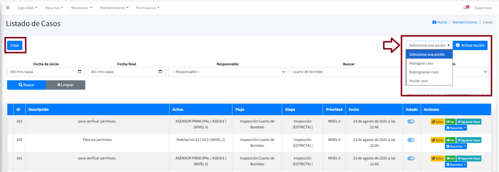 Para reprogramar casos se hace clic en la opción Selecciona una acción y se despliega la lista de acciones permitidas para el listado de casos, sobre esta al seleccionar la opción Reprogramar caso y hacer clic en el botón Activar Acción se muestra una vista de tabla que presenta una lista de casos de acuerdo con el filtro inicialmente aplicado (o ningún filtro), en esta vista se tiene la oportunidad de seleccionar el checkbox en cada fila que representa cada uno de los casos.