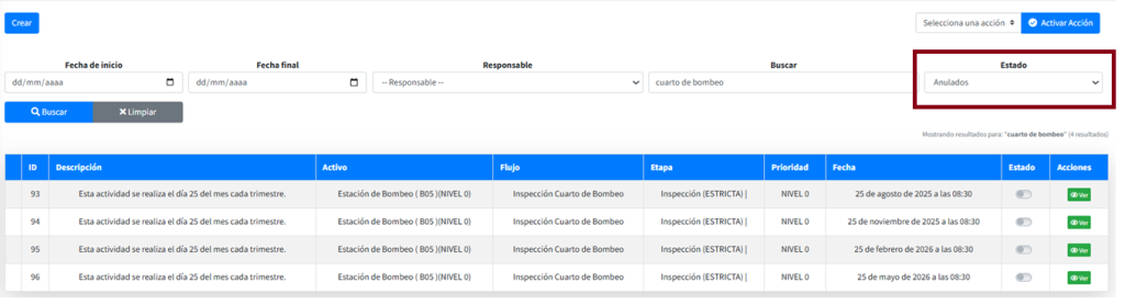 Para consultar los casos que se han anulados se debe seleccionar Anulados de la lista de selección Estado de la barra de filtros.