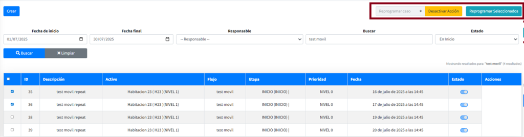 También se pueden seleccionar todos los casos visibles al seleccionar el checkbox de la línea del encabezado del listado, y seguidamente se hace clic en el botón Reprogramar Seleccionados.