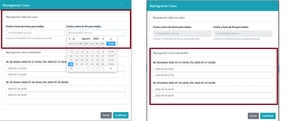 Las nuevas fecha de inicio y fin de caso se pueden asignar para todos los casos seleccionados, registrando los valores en la sección superior Reprogramar todos los casos. Pero si desea realizar la asignación diferente a cada caso, se deben registrar los valores en la sección inferior Reprogramar casos inidividuales; si opta por esta opción se deshabilitan los valores que exista en sección superior y será necesario registrar valores para cada caso.