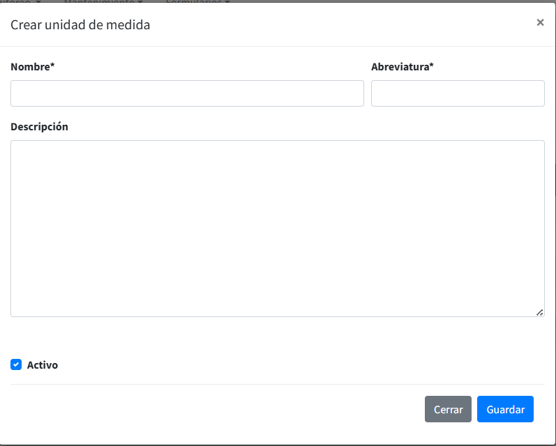 Para crear una nueva unidad de medida haga clic en el botón Crear y se habilita el formulario para registro de los datos, registre el nombre de la unidad, su abreviatura y una descripción que no exceda los 255 caracteres; para guardar haga clic en el botón Guardar.